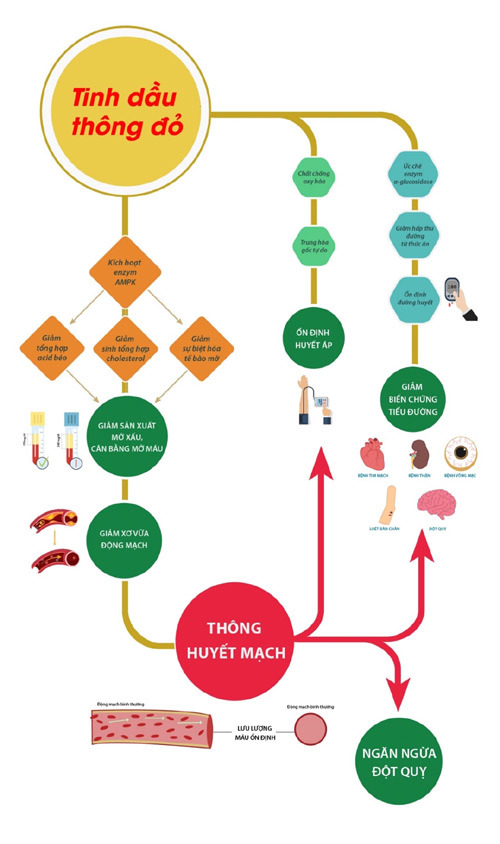 Theo các nghiên cứu mới nhất gần đây (2016) đăng trên tạp chí BMC Complementary and Alternative Medicine và Evidence-Based Complementary and Alternative Medicine, tinh dầu thông đỏ Hàn Quốc có tác dụng kích thích enzym AMPK (Adenosine monophosphate-activated protein) làm giảm tổng hợp acid béo, giảm sinh tổng hợp cholesterol, giảm sự biệt hóa tế bào mỡ. Từ đó, giảm sản xuất mỡ “xấu” như LDL, triglyceride; bào mòn dần các mảng xơ vữa bám trong lòng mạch và kết quả giúp thông huyết mạch, tác dụng giảm xơ vữa cũng xảy ra trên mao mạch nhỏ nơi mà các phương pháp tiếp cận can thiệp của y học hiện nay vẫn hạn chế.